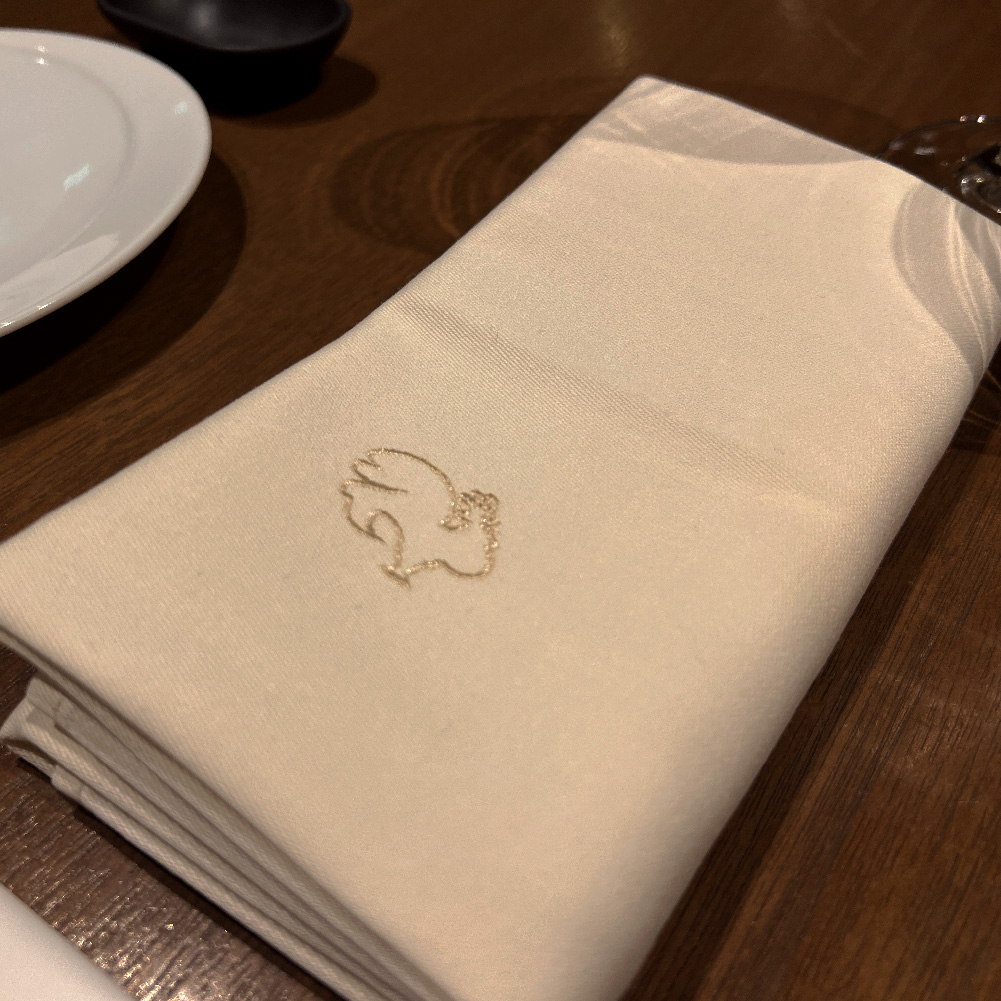 ロゴ入りテーブルナプキンにも、シェフ ドミニクの思いが込められています。シェフ ドミニクは幼い頃、祖母が刺繍でDominiqueと書いてくれたナプキンを使っていたそうです。家族がそれぞれ自分の名前の入ったナプキンを朝昼夜と使うのがフランスの伝統であり、一般家庭の常識でもあった時代。