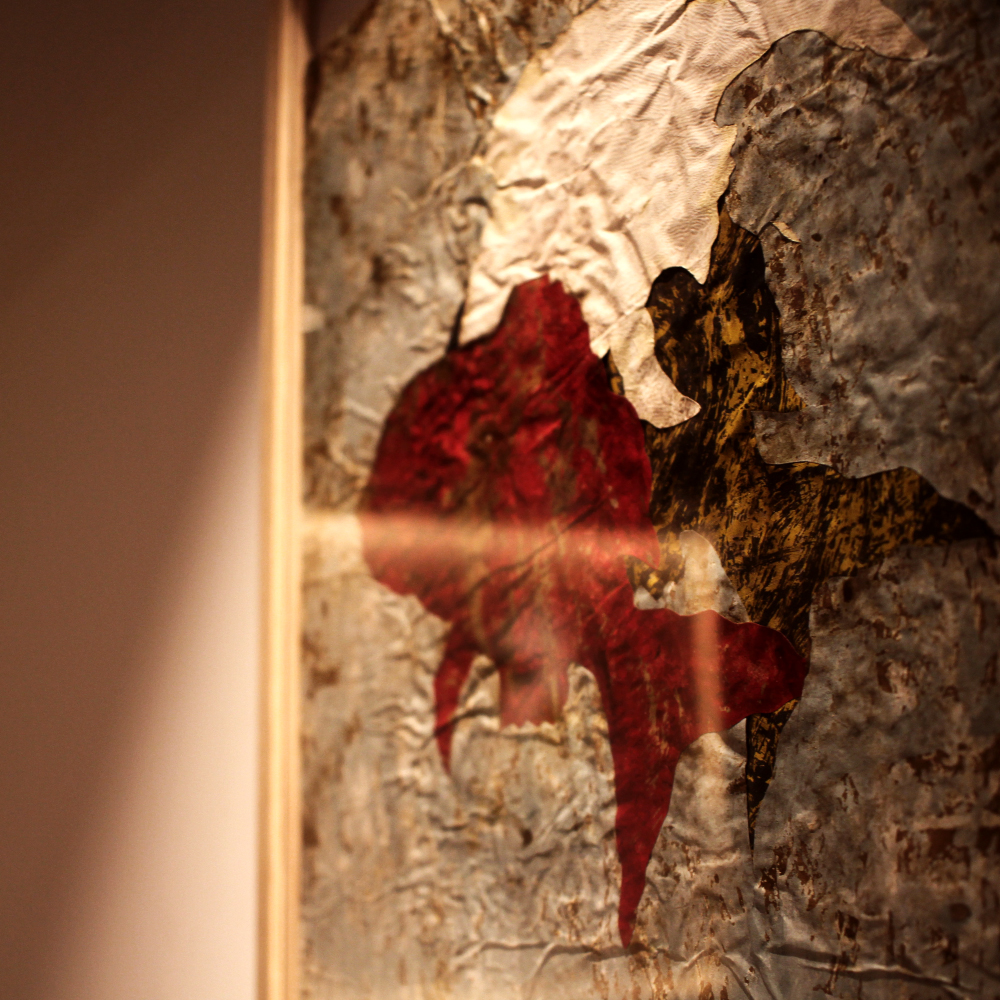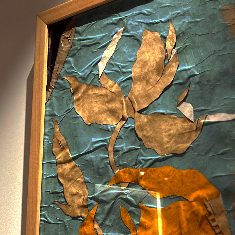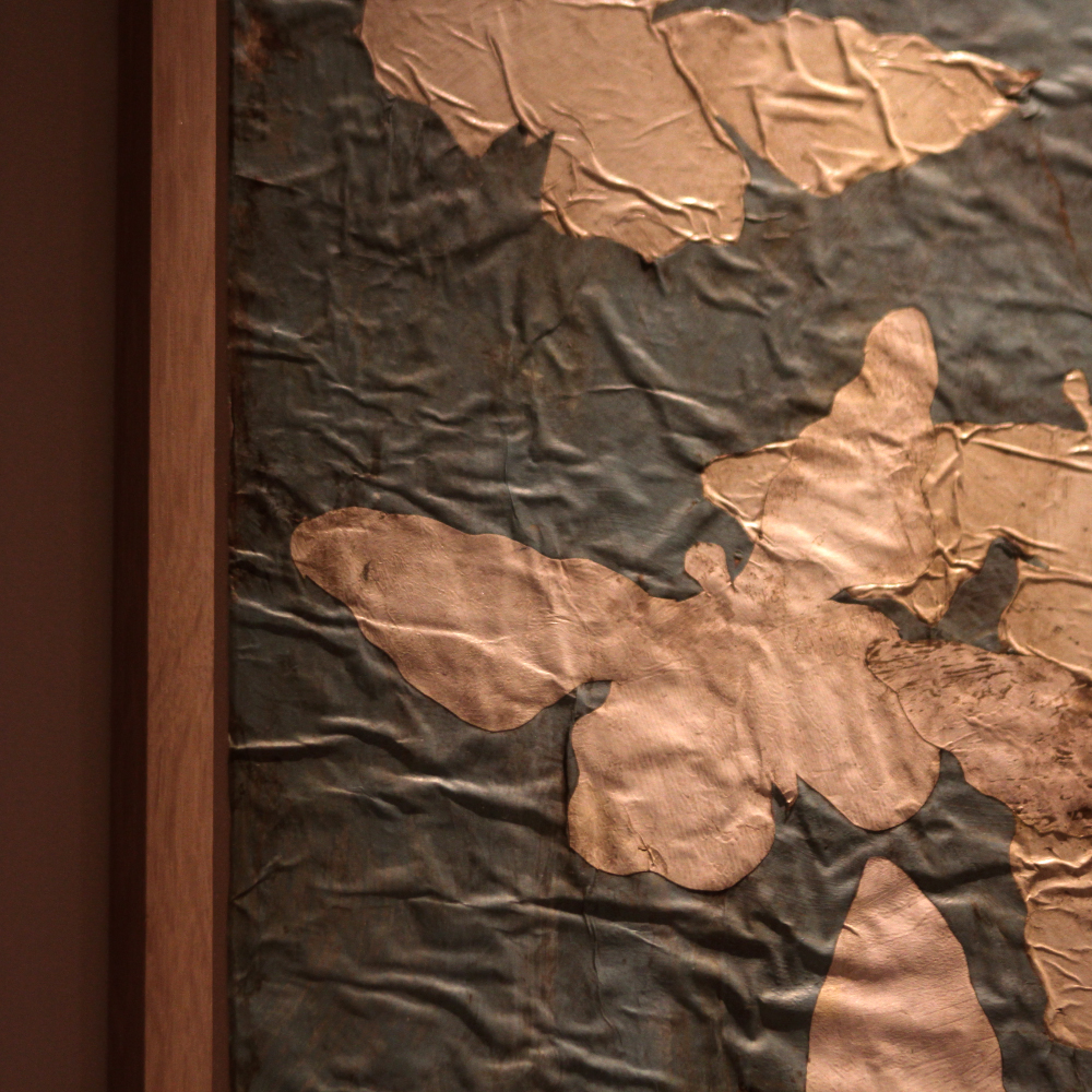 葉っぱ、鳥、ハートなどが、彼の特有な手法である、グラッタージュ(表面を削る)やコラージュ(糊付け)にて構成されたアートです。