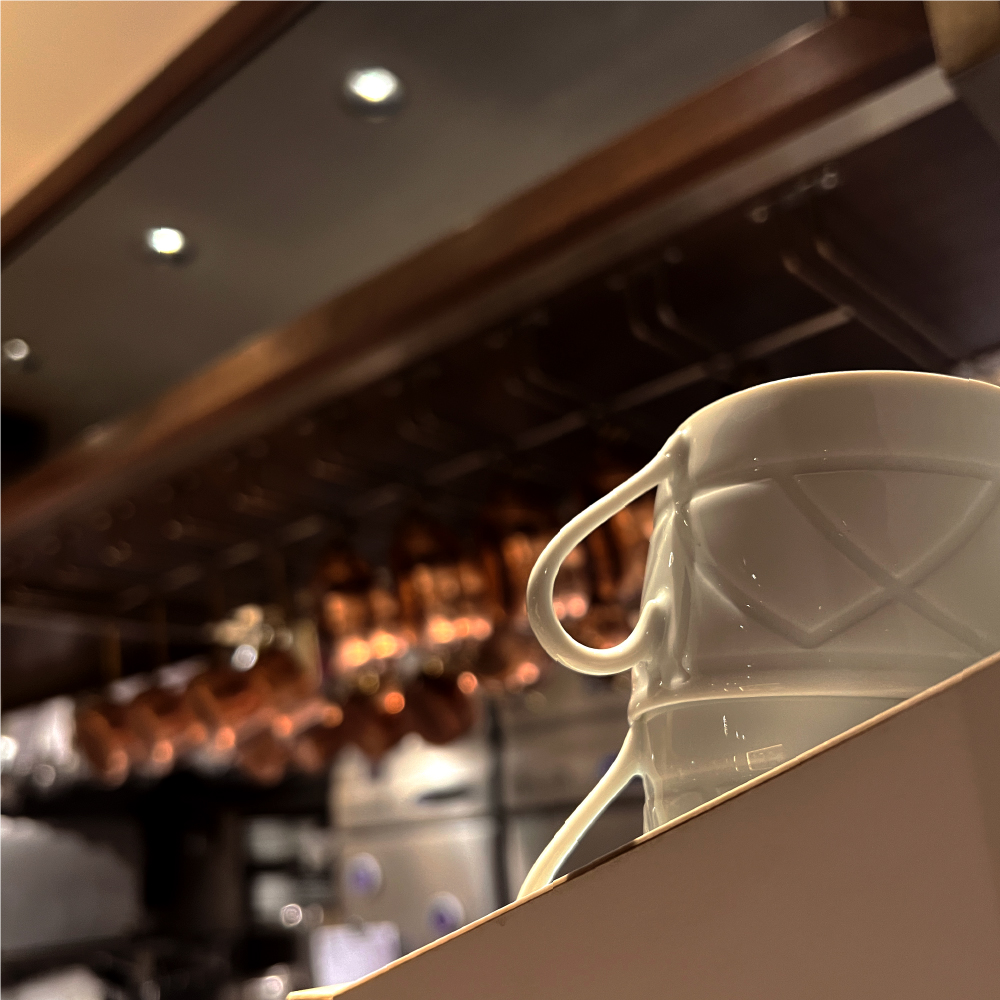 オープンキッチンのカウンターで出番を待つティーカップは、フランス、リモージュの磁器ブランド「HAVILAND(アビランド)」のものです。
