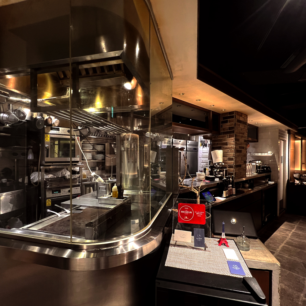 内装は広いオープンキッチンから奥に続く厨房が見えるのが特徴的。