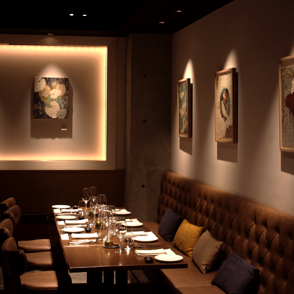 フランスのカマルグにアトリエを構えフランス、アメリカを中心にグローバルに活躍するアーティスト『Pierre Marie Brisson』(ピエール = マリ・ブリッソン)。シェフ ドミニクと40年来の友人であるピエール = マリの最新の作品を店内全体に展示しています。