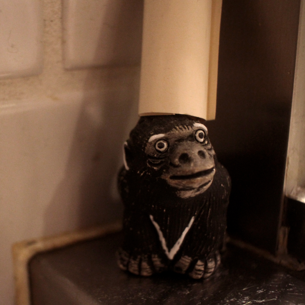 いつ誰が置いたのか、どこから来たのか、身元不明のゴリラくん。コック帽を被り(誰が被せたかも不明)シェフ気取りの彼を、シェフ ドミニクはKintaroと呼んでいます。