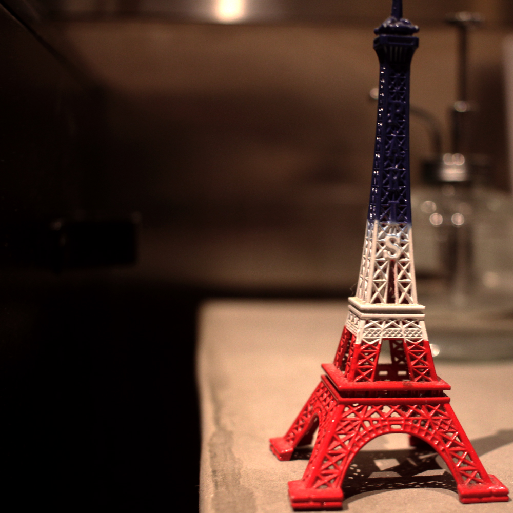 エッフェル塔がこのミニチュアのように青、白、赤のトリコロールカラーにライトアップされたのは、2015年11月16日、パリの同時多発テロ事件を受けて閉鎖されていたエッフェル塔が営業を再開した日です。テロに屈しない姿勢を示し、犠牲者の方々を追悼するためでしたが、夜空にたなびく三色旗のごとく、悲しいほど美しいそのエッフェル塔を間近で見てきたシェフ ドミニクにとって、このミニチュアには特別な思いがあるようです。