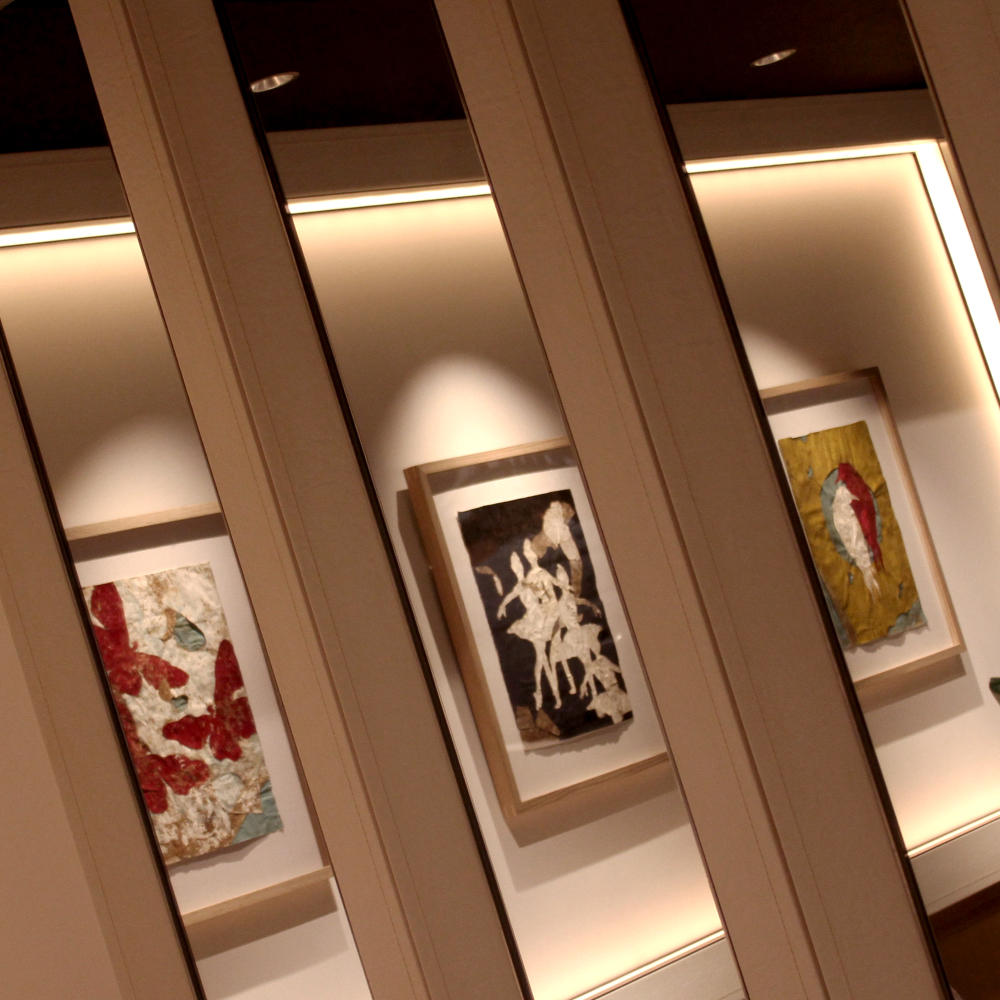 普段はシェフ ドミニクの古くからの親友、ピエール=マリ・ブリッソンの作品をご覧いただいていますが、これまでお着物の帯のアートや自閉症スペクトラムの方たちの作品など、様々な展示をしてきました。